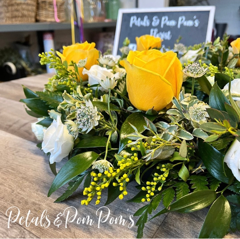 A classic and elegant wreath of sunshine yellow and pure white seasonal flowers.