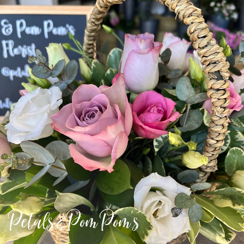 Florist choice seasonal flowers elegantly displayed in a reuseable basket.