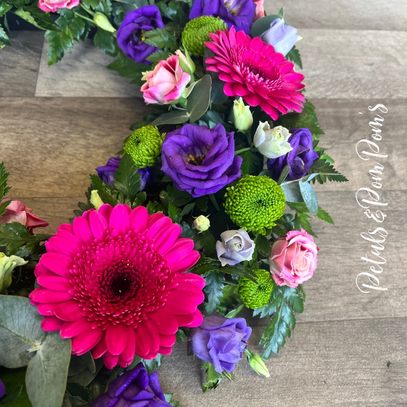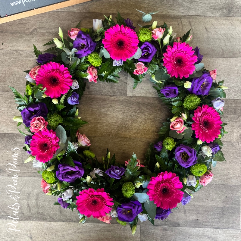 A charmingly bright wreath combining vibrant pink and rich purple flowers.