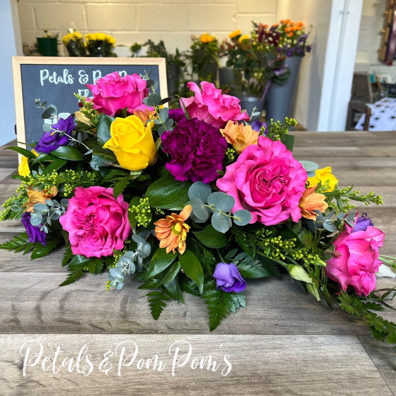 A vibrant tear drop spray featuring bright pink, yellow & purple seasonal flowers carefully arranged with fresh foliage