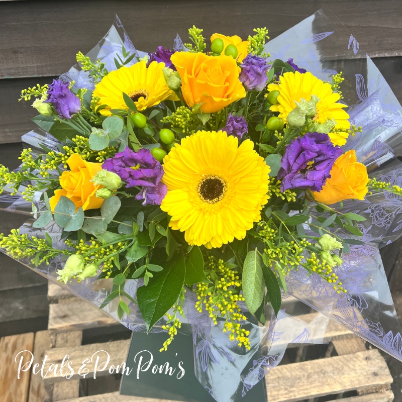 A vibrant hand-tied bouquet bursting with cheerful yellow & purple seasonal flowers, gift wrapped in water perfect for any occasion.