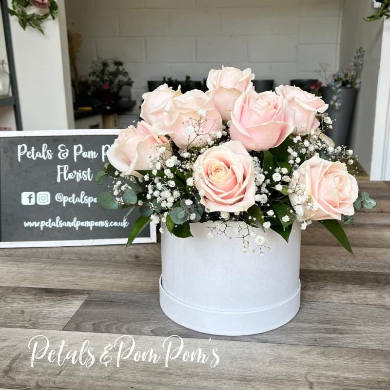 Soft blush pink roses arranged with eucalyptus and gypsophila in a reusable keepsake box.